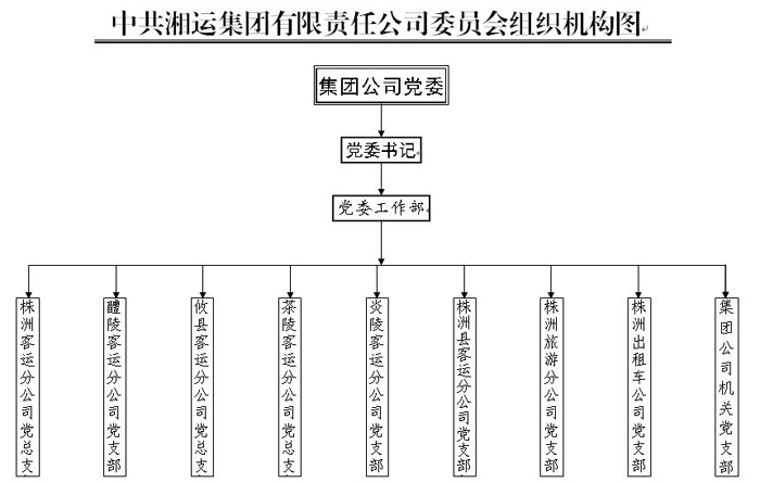 中共湘運集團有限責(zé)任公司委員會,隸屬于中共株洲市非公有制經(jīng)濟組織工委。黨委會常設(shè)工作機構(gòu)黨委工作部。全司共有中共黨員304名。下轄株洲客運分公司黨總支、醴陵客運分公司黨支部、攸縣客運分公司黨總支、茶陵客運分公司黨總支、炎陵客運分公司黨支部、株洲縣客運分公司黨支部、株洲旅游分公司黨支部、株洲出租車公司黨支部、集團公司機關(guān)黨支部共9個二級基層黨組織。